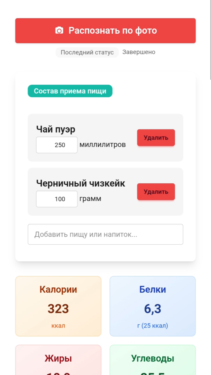 Сфотографируйте приём пищи → проверьте и поправьте продукты → получите КБЖУ и нутриенты автоматически.